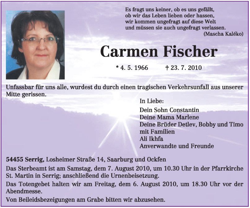 | Carmen Fischer "Fischi" "Fischi" war eine Arbeitskollegin, die ich sehr mochte. Sie starb am 23. Juli 2010 durch einen Autounfall. Kurz vor ihrem tödlichem Autounfall, vor Zerf, hatten wir uns noch für den folgenden Sonntag, an dem sie frei hatte, in Saarburg verabredet. Wir unterhielten uns immer boarisch... und wir hatten eine Gemeinsamkeit: Fischen im Allgäu! Als ich in Soho auf Uffz-Lehrgang war, arbeitete sie dort. ![]() |