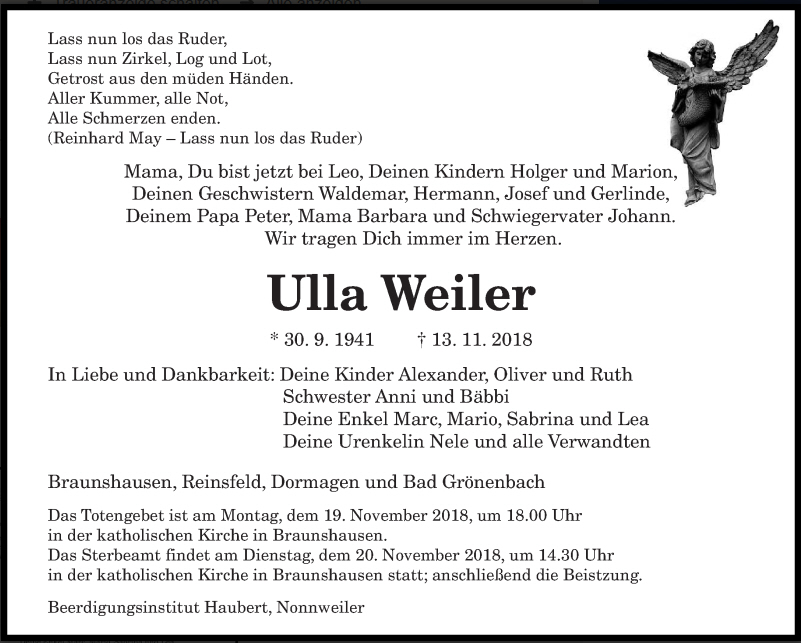 Reinsfeld) starb am 13. November 2018 nach erfolgreicher Reanimation nach 8 Tagen Wachkoma. Am 6. November erhielt ich eine SMS (vermutl. von meiner Schwester), dass Mama im Khs lag. Anfangs hegte ich noch Hoffnung, weil man sagte, dass der Herzstillstand nicht so lange war (Pupillenerweiterung - sie waren noch relativ eng). Bedingt durch die HLW kam es zur Fraktur von drei Rippen. Man erkannte allerdings erst einen Tag später, dass das bei ihr bekannte Lungenemphysem (Pulmo dexter oben) einen Riss hatte und so Luft in die Brusthöhle einströmte, was einen Druck auf die Lunge auswirkte, die dann kollabierte. Sie bekam dann eine Drainage für Gewebewasser und Blut und eine Absaugung der Luft. Ab 14.00 Uhr wachte ich neben ihr, dann von morgens 9 bis abends um 21 Uhr. Der Samstag war für mich ein schlimmer Tag, ab da wusste ich, dass sie geht. Am Montag wurde das Ergebnis vom Neurologen eröffnet, was dann konform mit der Patientenverfügung war und die Maschinen abgeschaltet wurden. Am 13. November 2018 um 11.25 ist sie eingeschlafen. Ganz friedlich. Ich vermisse Mama sehr, aber sie ist immer da, sobald ich an sie denke. Lass nun ruhig los das Ruder (aus dem Album "dann mach´s mal gut, 2013, Universal Music GmbH - Youtube-Link mit Text), von Reinhard Mey fand ich einen passender Text. ![]()